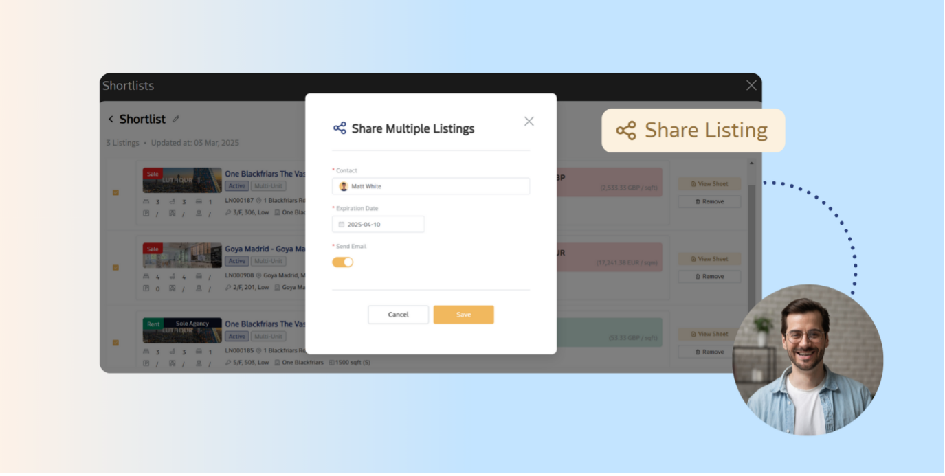 2. Open the shortlist, tick the listings you want to share once again, and hit “Share Listing.” Then, enter the contact’s name and expiration date to start the live sharing process.